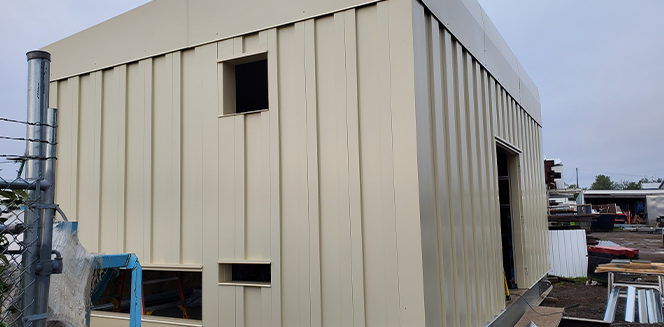 Our buildings are pre-engineered structures with no structural steel. The walls are engineered to support the roof loading, making these buildings ideal for remote applications where cranes and transport vehicles can’t access. Rigid steel buildings are 28ft maximum in width. They can be however long you need, and have a maximum wall height of 14ft.